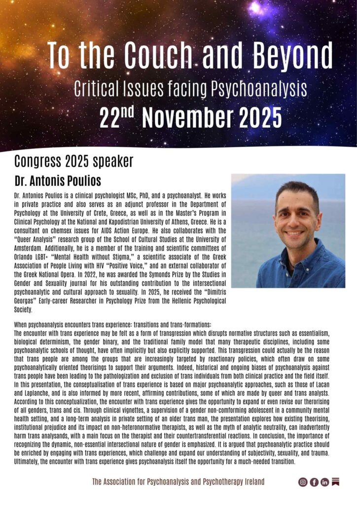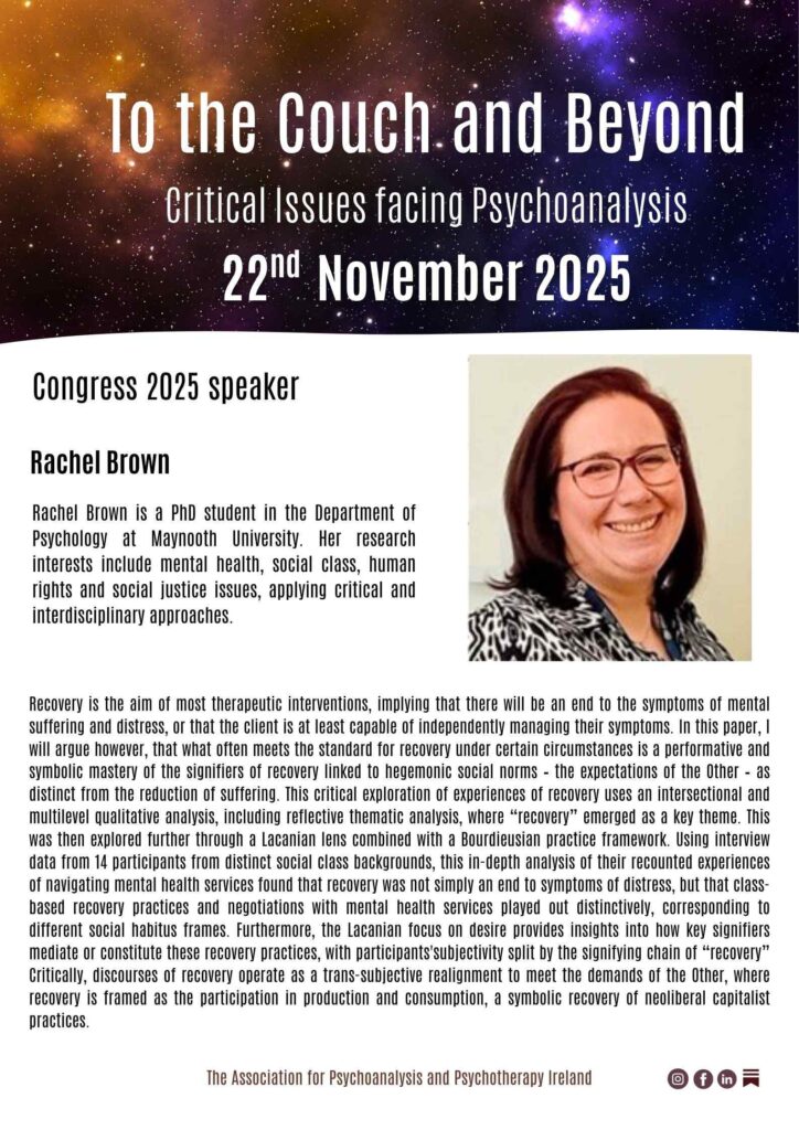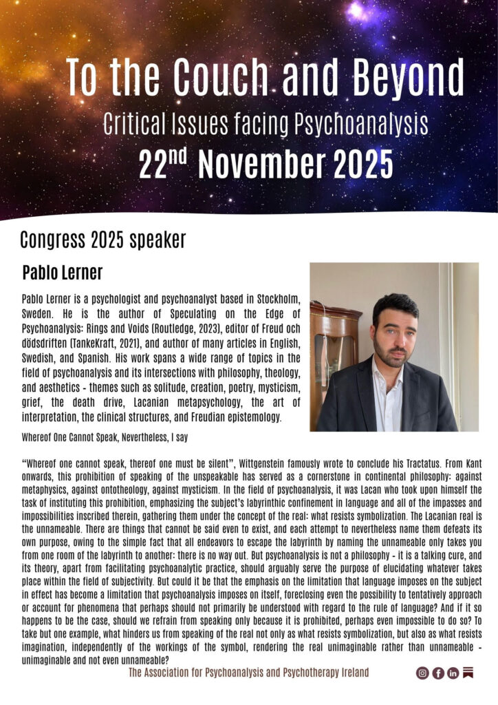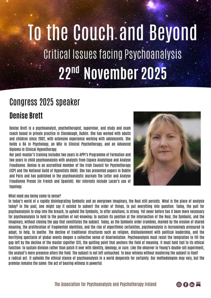 Following on from the publication of “The Aetiology of Hysteria”(Freud, 1896) which Freud had hoped would bring him unprecedented accolades but which was met with silence and indeed hostility, Freud confides in Fleiss, “I am as isolated as you could wish me to be: the word has been given out to abandon me, and a void is forming around me.” Freud and Lacan spoke of subjective destitution, as a reformulation of subjectivity, a political discourse, and indeed that of the Analysts position regarding knowledge. Affirmation of the first critical issue facing psychoanalysis.